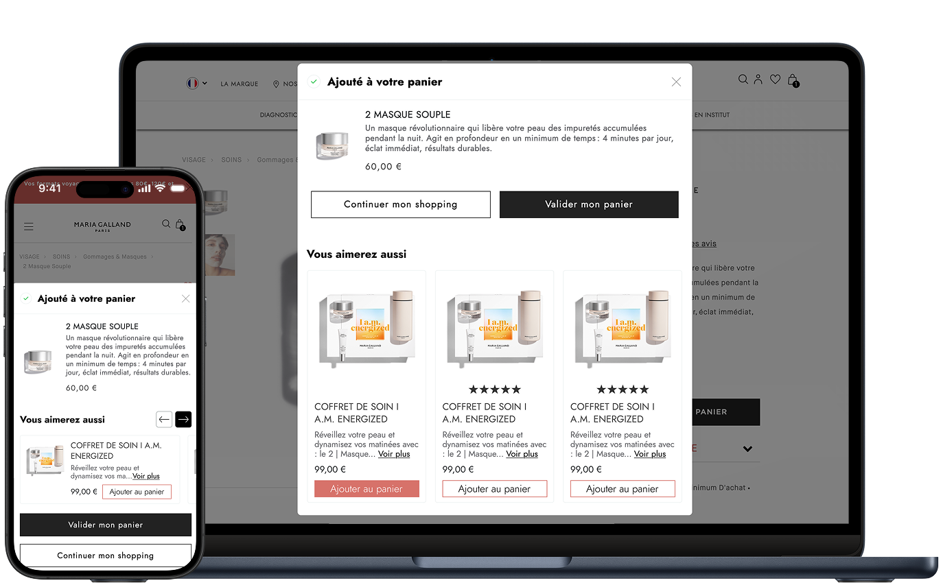 For our client Maria Galland, we added a product recommendation to the mini shopping cart to encourage visitors to add products to their order.